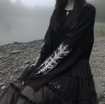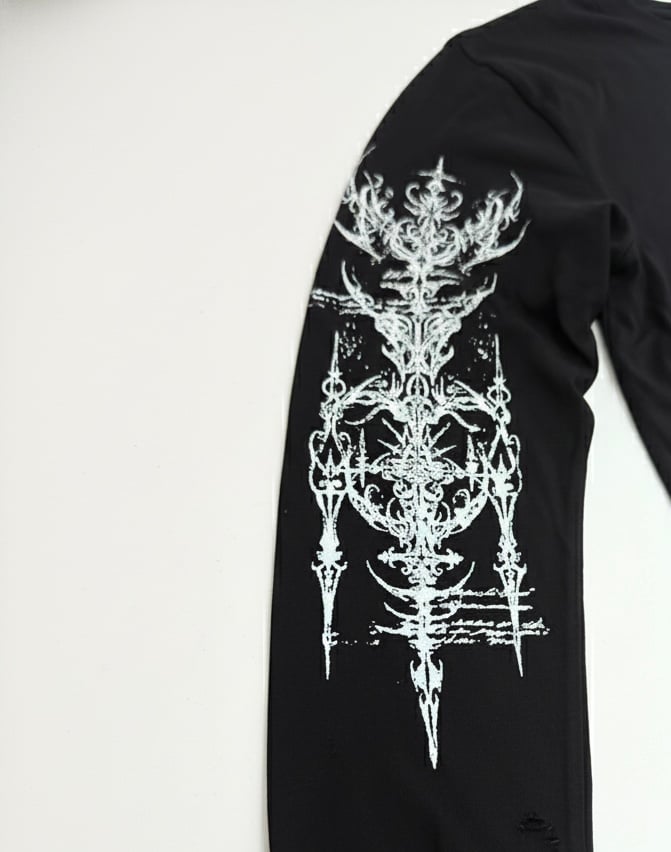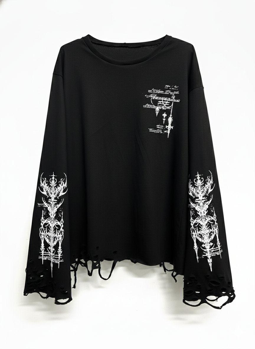 Long sleeves, distressed finish details, silkscreen printing. S & L sizes.